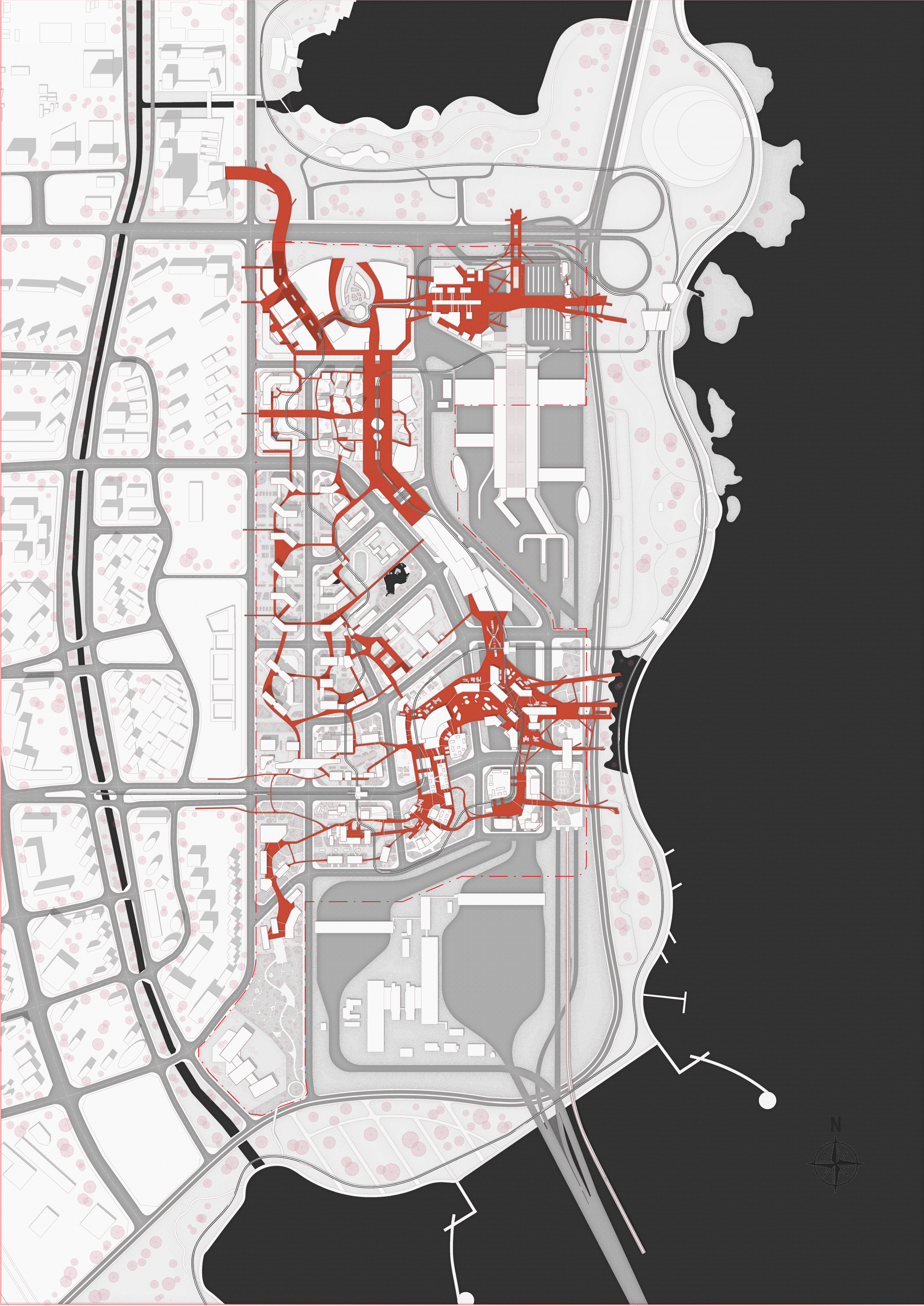The project is designed strategically with low height dense development, second-floor capillary platform, function dominate planning. Introduced industries include logistics, entertainment, creativity incubator, and real estate. Based on the context analysis, the logistic function sets in the north, real estates and community facilities are placed in the middle part. At the same time, creative industries are assigned in the south. The whole area is connected by a broad second-floor pedestrian platform and several light rails, while cargo transportation is placed underground. People, cars, lorries would be active in separated elevations, and traffic noise is limited below people’s area. The whole site is planted with botany suitable for the local environment instead of a large plank of concrete.